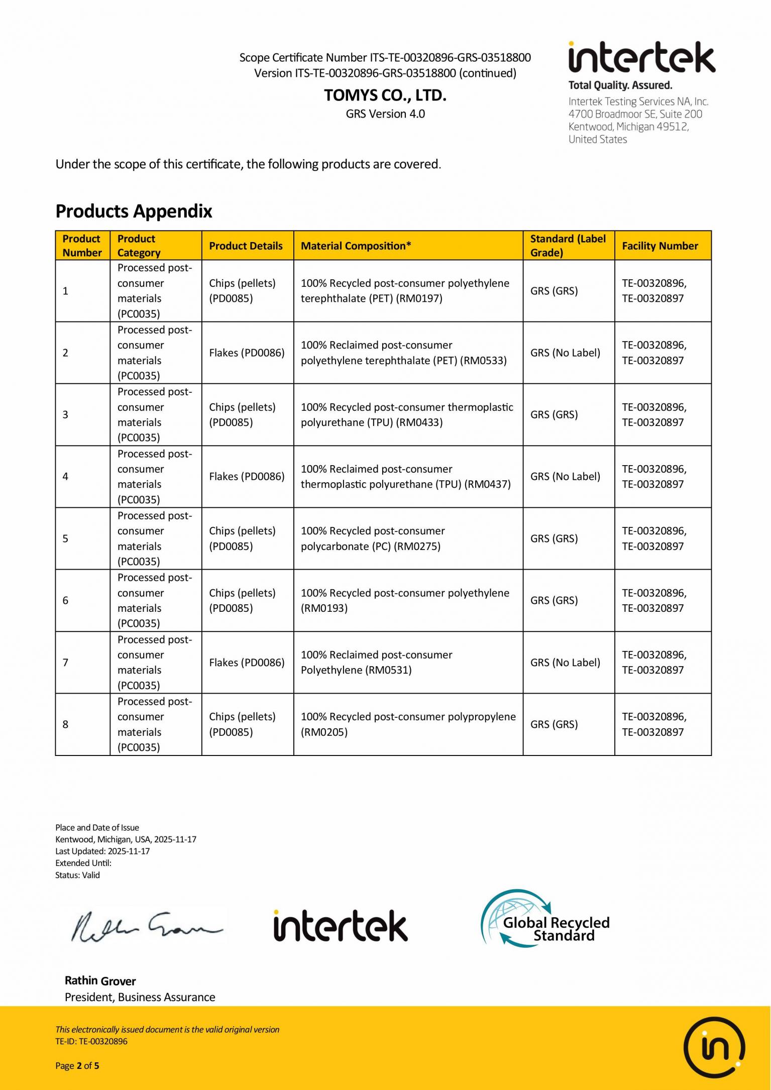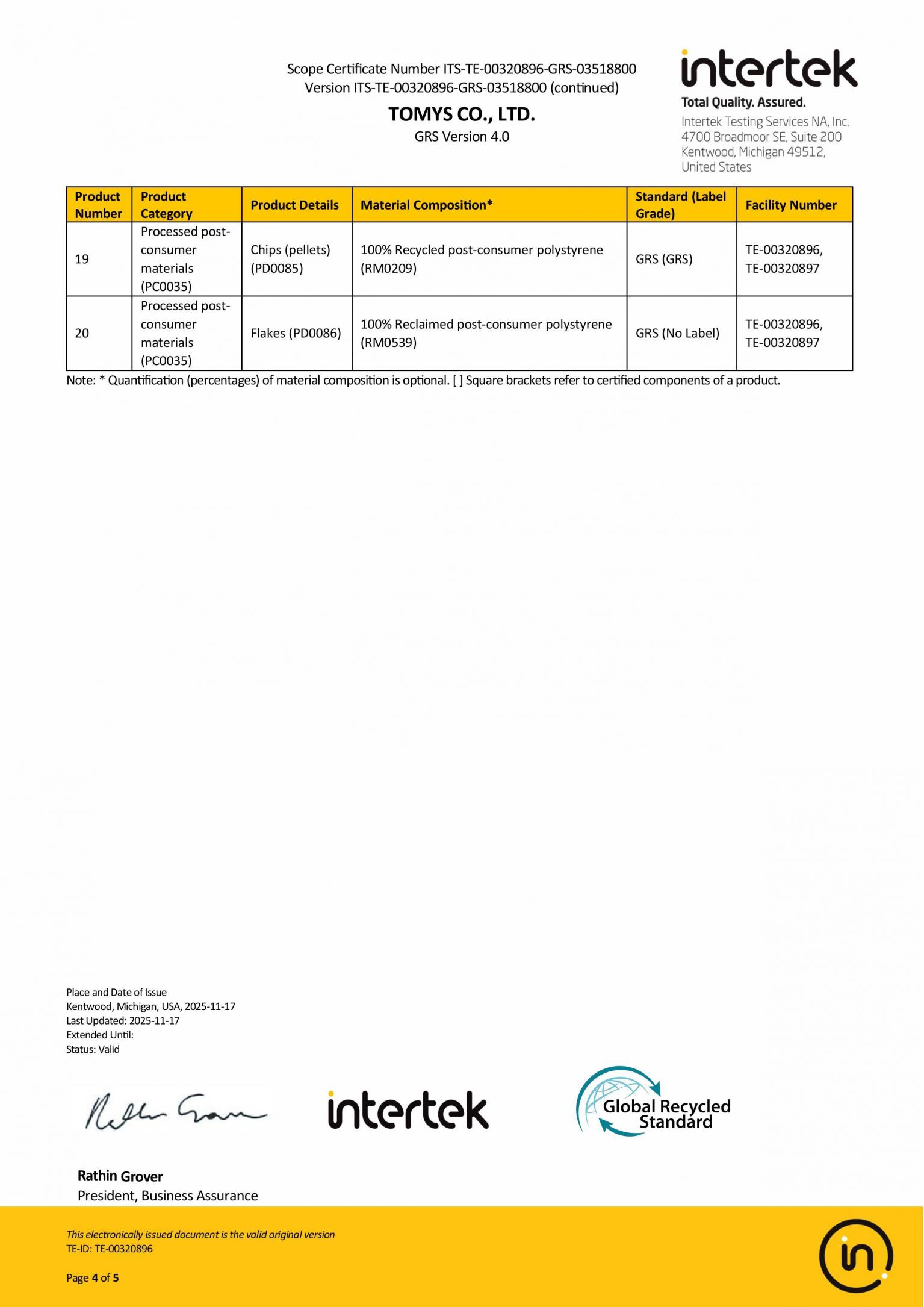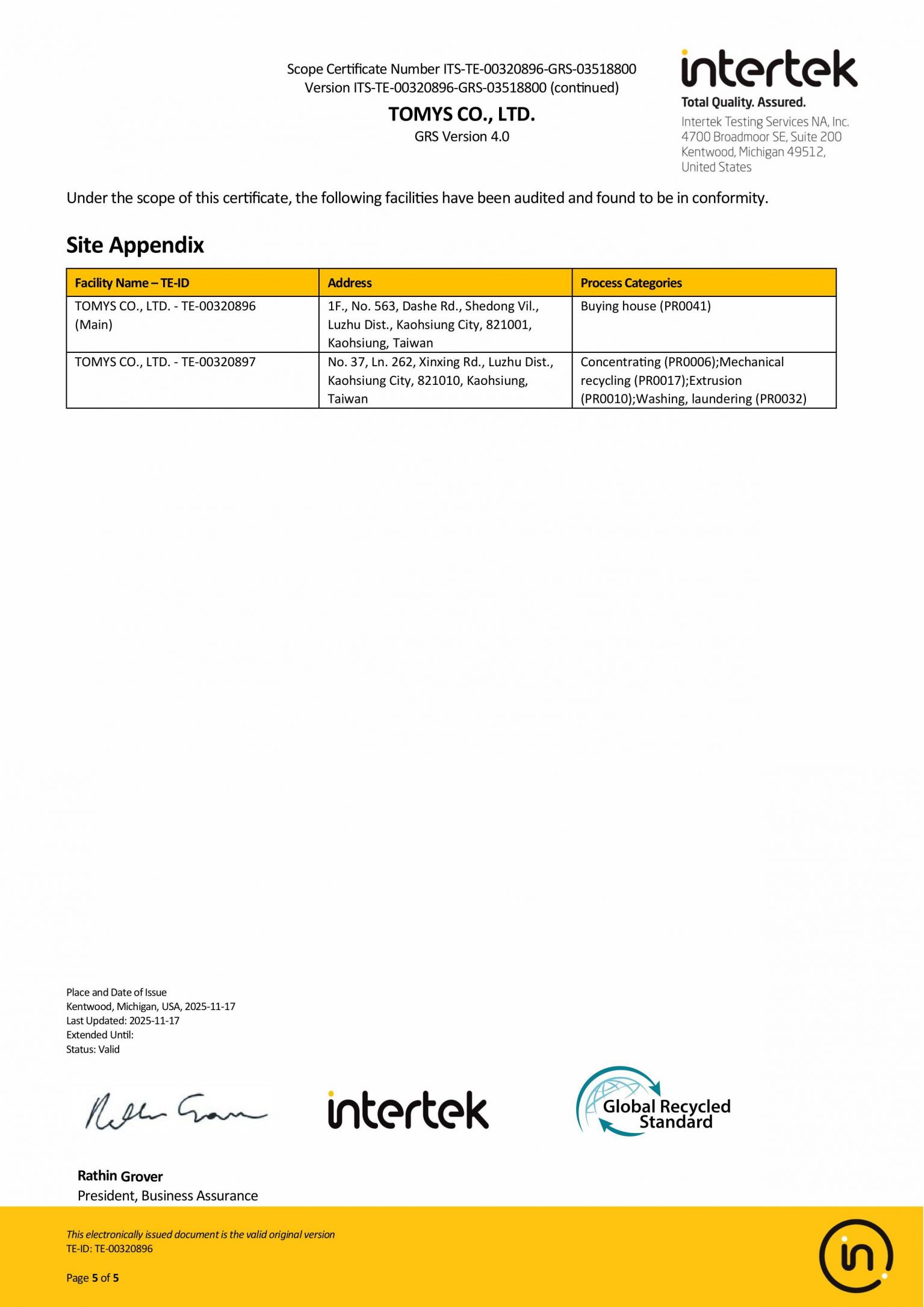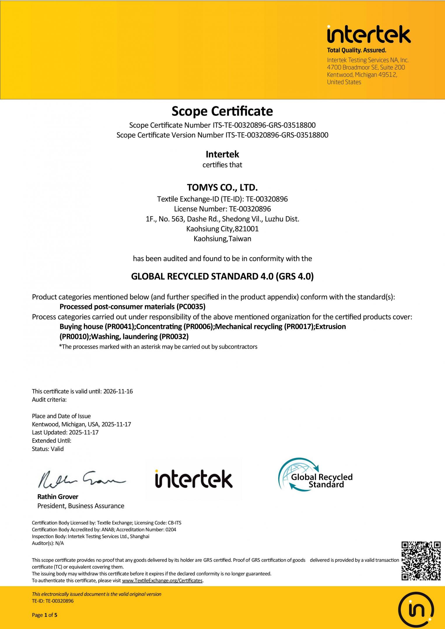 審核通過 全球回收標準 4.0 (GRS 4.0) Scope Certificate Number ITS-C26881-GRS-01799800